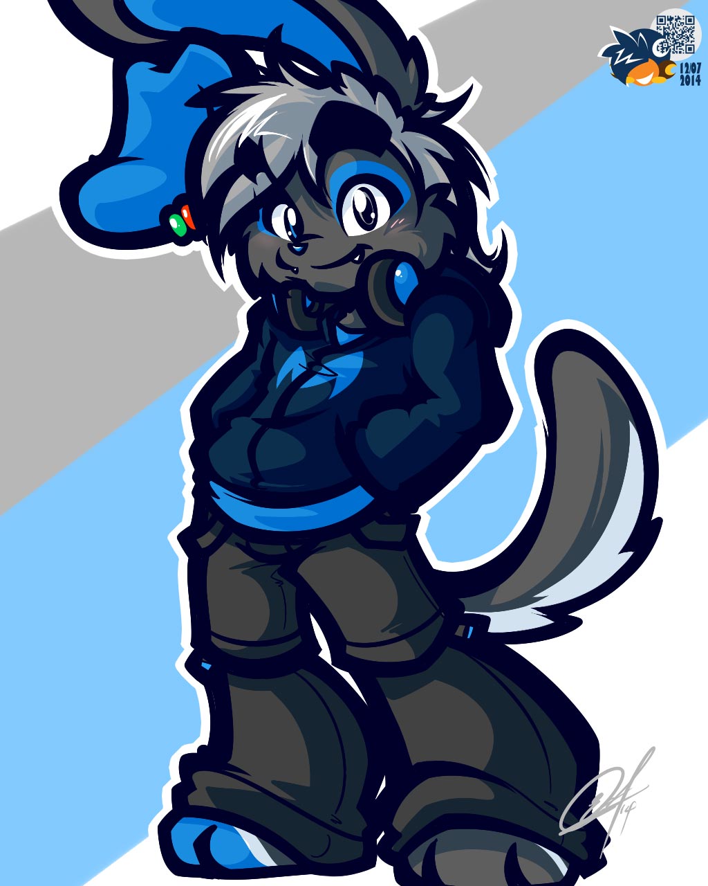 My fursona is Wyle. A unusually tall black furred Cabbit (he's 30% long eared cottontail rabbit mixed with 70% Maine coon Cat) standing at 6ft. 4in. Tall. Has spots of blue fur on his right ear, left hand and right foot. Around new people he's shy but opens up quickly revealing his positive and friendly attitude. Sooner or later he's being his usual self. Laughable automotive, computer techie, and music lover.
